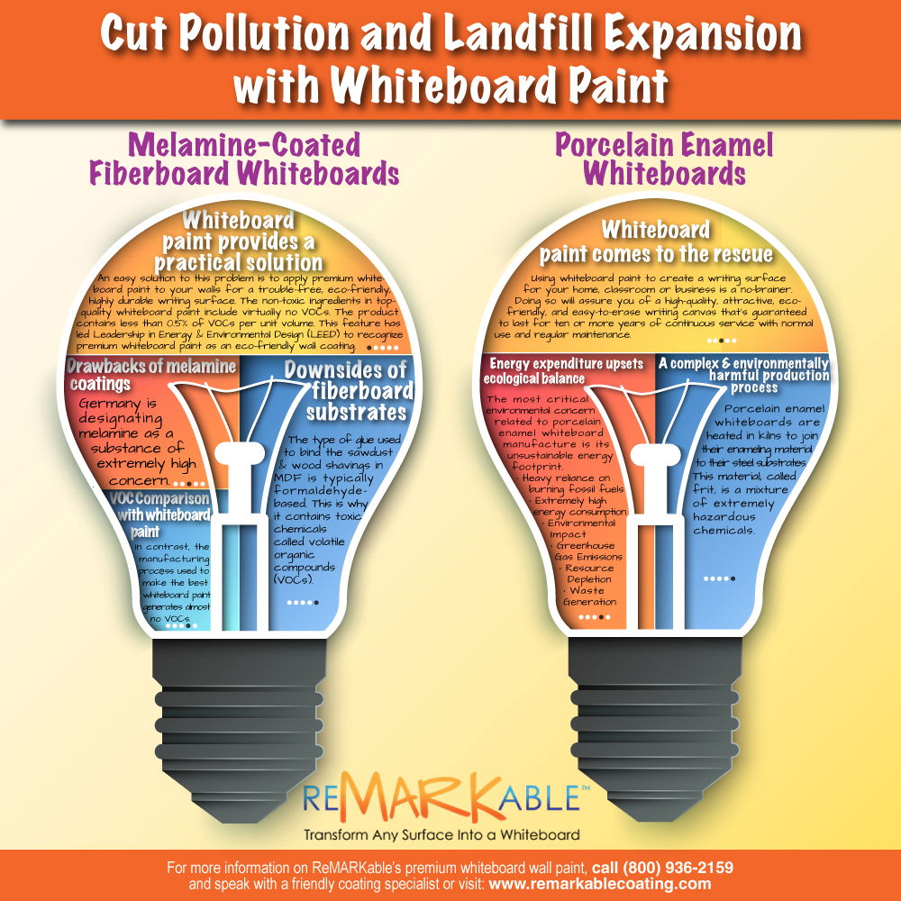 Premium whiteboard paint offers an easy way to help you address two of today’s top environmental problems: pollution of our planet’s air, land, and water by toxic chemicals and the constant expansion of landfills.