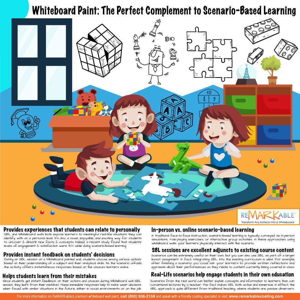 Whiteboard paint applied to classroom walls takes scenario-based learning to new levels of value and excitement for students and teachers alike. Scenario-based learning (SBL) has been shown to be a powerful tool for aiding knowledge retention in learners of all grade levels. As a result, it helps to overcome one of the greatest challenges educators face today: getting students to permanently remember the facts and skills they have acquired in the classroom for use in later life.